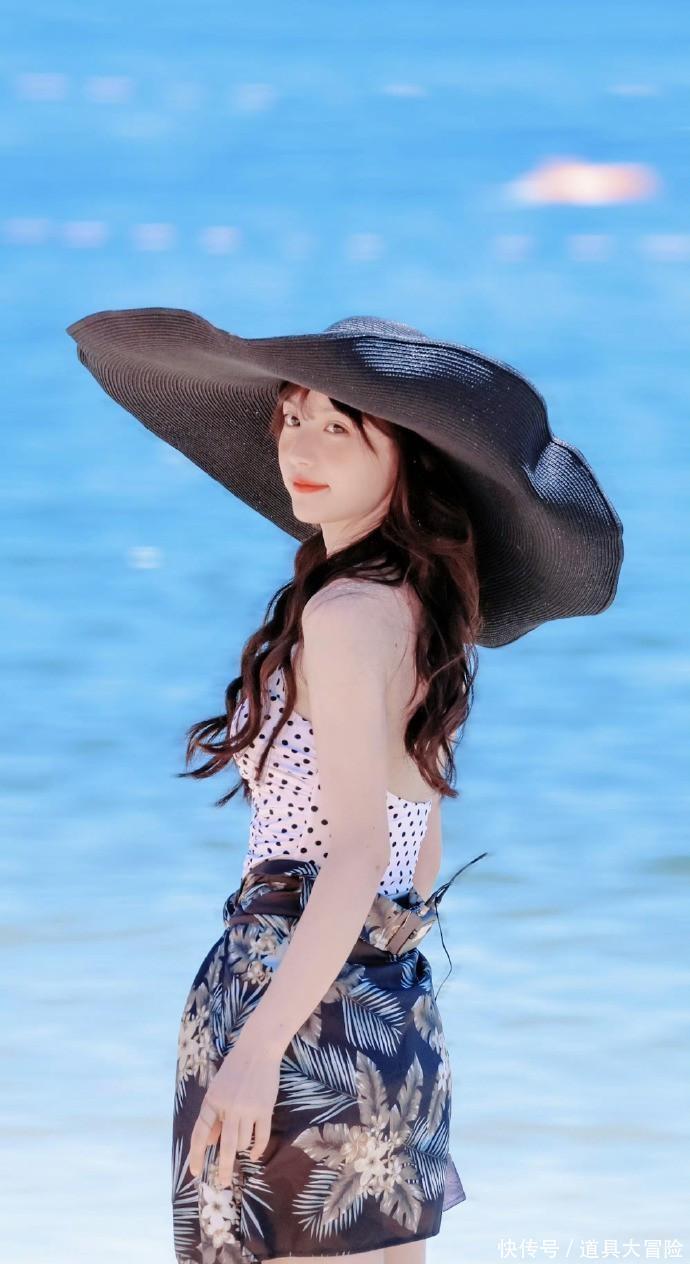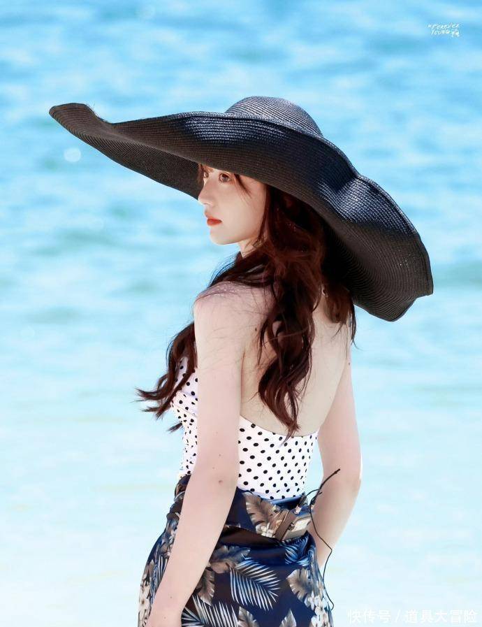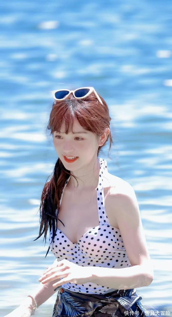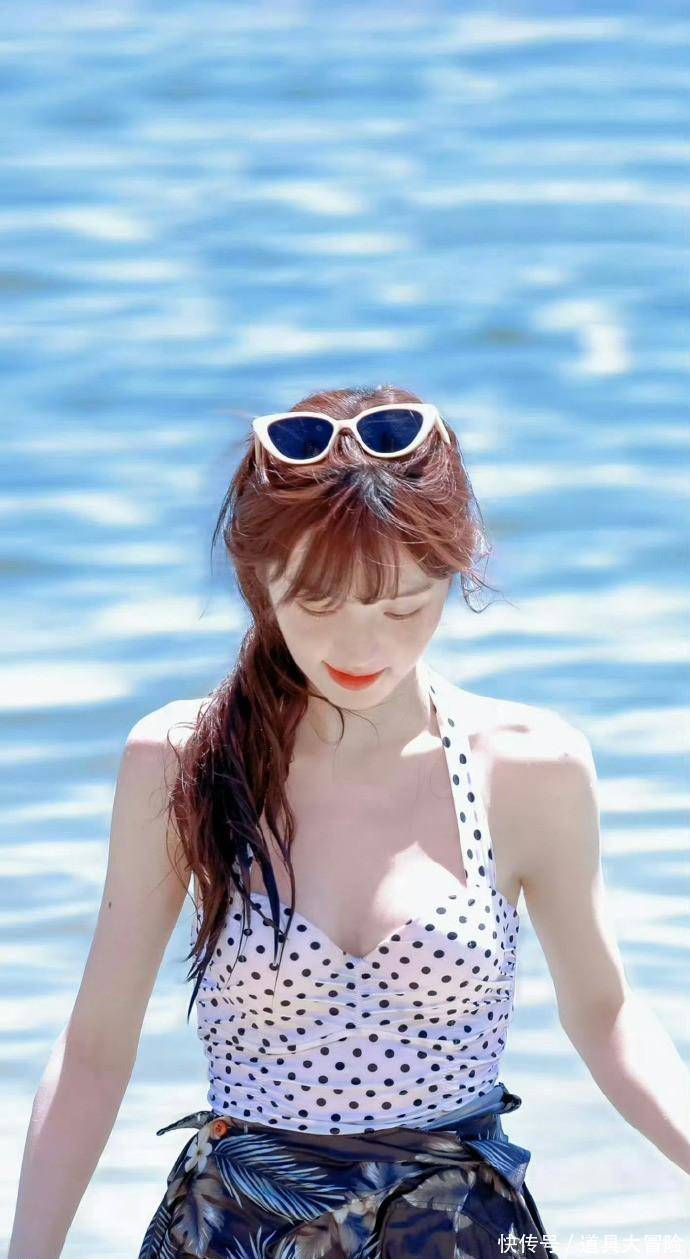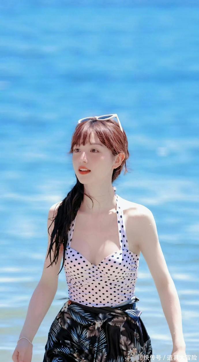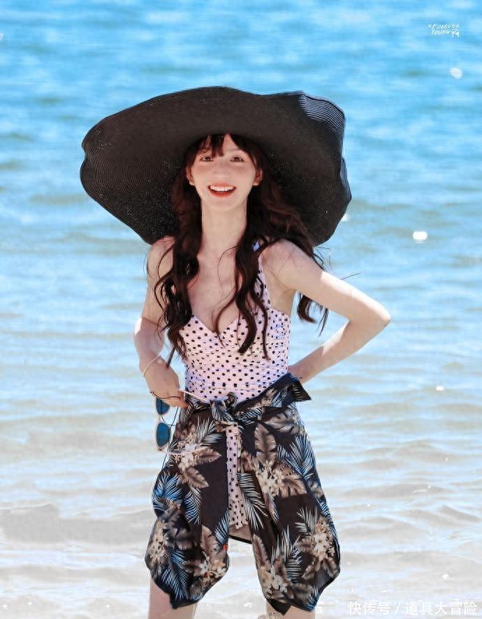 镜头里,田曦薇一身复古波点泳装,外搭印花纱裙,头顶超大草帽,脚踩细软白沙,像从日漫里走出的夏日女主。她时而迎着海浪回眸一笑,时而低头拨弄被海风吹乱的长发,每一个动作都自带“少女滤镜”。阳光落在她身上,连飞溅的水珠都闪着糖霜般的甜光,难怪网友齐刷:“田曦薇把海边度假风玩明白了,这套穿搭我立刻抄作业!”
